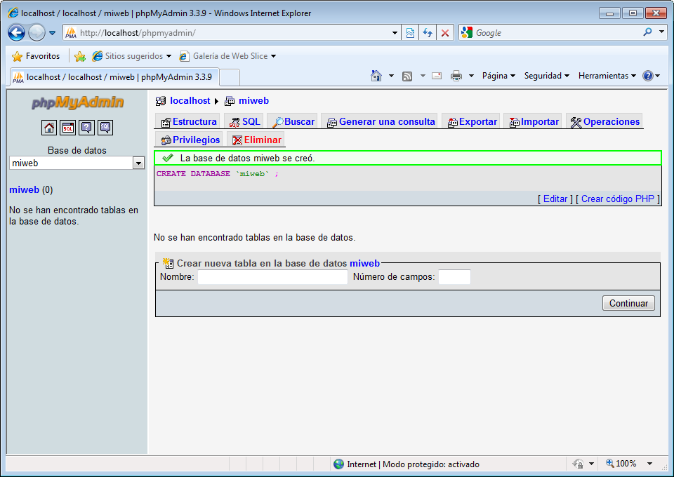 Ya tengo creada mi base de datos - miweb - usando phpMyAdmin, como podéis ver el la imagen.