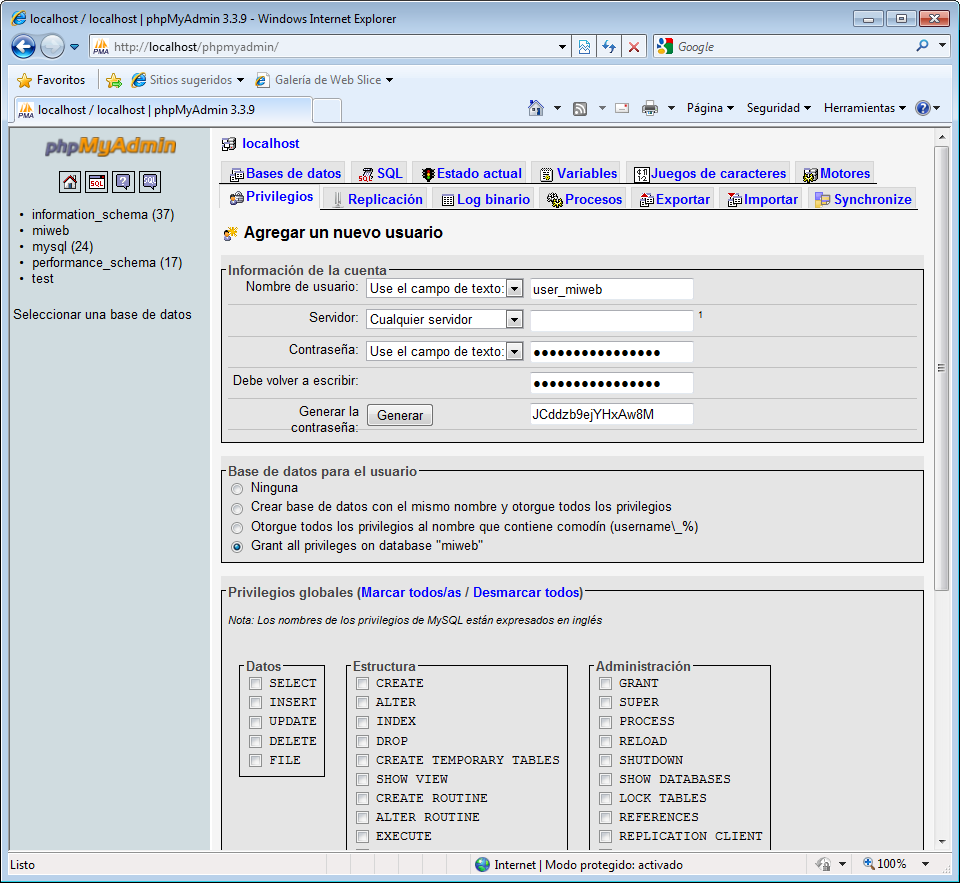 Aparece la página siguiente para que introduzcamos los valores para nuestro nuevo usuario, en nombre de usuario introducimos por ejemplo - user_miweb -, una password, la volvemos a escribir y por último los privilegios que va a tener nuestro usuario, para los que empezáis con MySQL os recomiendo que marquéis - Grant all privileges on database " miweb " - para que no os metáis en errores continuos de - El usuario miweb no tiene privilegio para esto o lo otro -, sino podéis marcar los privilegios que queráis en el cuadro - Privilegios globales - , pulsamos el botón - Continuar -