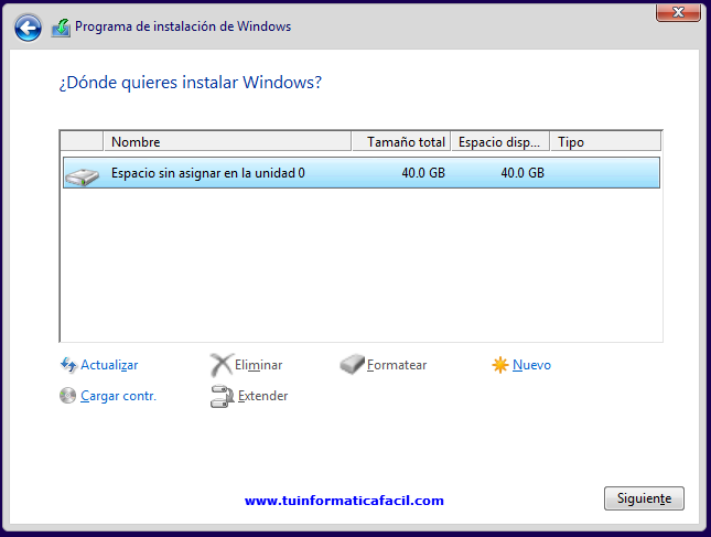 Si el disco duro no está particionado tendrás una sola línea en la lista, en la columna – Nombre – podrás ver – Espacio sin asignar en la unidad 0 –, en las columnas – Tamaño total – y – Espacio disponible – debe aparecer el mismo valor dependiendo del tamaño del disco duro, ver imagen 7, si este es tu caso pasa directamente al punto – Preparar disco duro –.