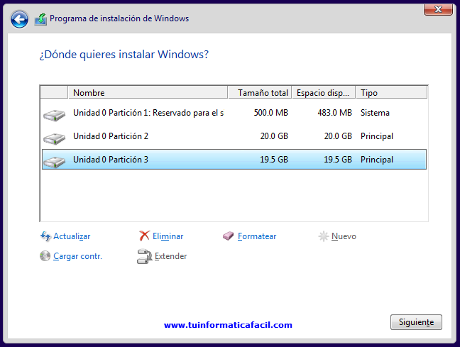 Una vez hayas tengas preparado el disco selecciona en la lista la Unidad 0 Partición 2 y haz clic sobre el botón – Siguiente – para iniciar la instalación.