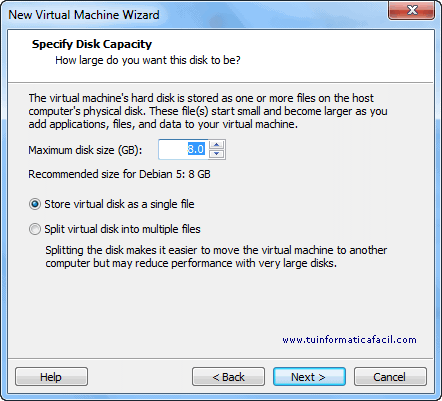 Especificación de capacidad de disco, en - Maximum disk size - introduciremos el tamaño máximo del disco que vamos a asignar la máquina virtual, posteriormente podremos añadir más discos, podemos elegir entre que el disco se cree un solo fichero del tamaño que hayamos seleccionado – Store virtual disk… - o que lo divida en ficheros de 2 GB – Split virtual disk -, esta opción pude ser interesante para mover nuestra máquina virtual de una máquina física a otra al ser los ficheros más pequeños, dejo el tamaño que me recomienda VMware para Linux Debian, 8 GB y en un solo fichero, pulsamos