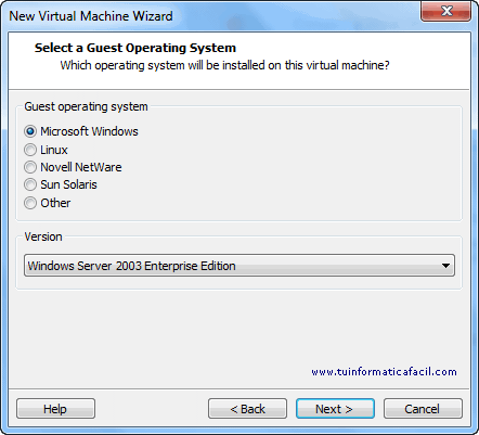 En esta venta seleccionamos el sistema operativo que vamos a instalar en nuestra máquina virtual, seleccionamos ‘Microsoft Windows’ y el combo Versión seleccionamos Windows Server 2003, pulsamos ![]()