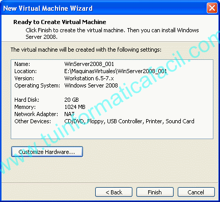 Ya tenemos prepara nuestra máquina virtual, antes de terminar vamos a personalizar un poco el Hardware, pulsamos – Customize Hardware –