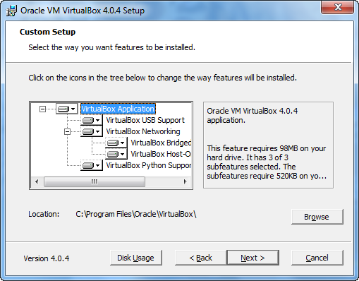 En la siguiente ventana del asistente nos aparece en forma de árbol la información de las características de Oracle VirtualBox 4 que se van a instalar.